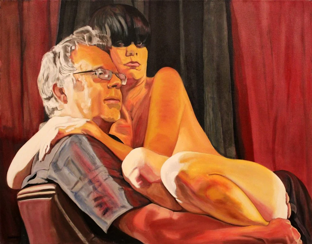 Christopher occasionally uses red and blue flood lights on his figures to give unusual reflections which heighten the subjects’ emotional undertones. His technique of underpainting mimics the old masters but he shifts to a more contemporary style through expressive brushstrokes.